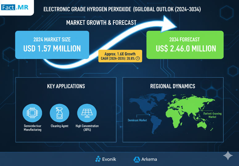 In an age where micro-precision and ultra-clean surfaces are essential, the Electronic Grade Hydrogen Peroxide (EGHP) Market is quietly becoming one of the most critical components in the semiconductor, photovoltaic, PCB, and display manufacturing value chains. Designed to deliver extremely low contamination, superior oxidizing power, and reliable cleaning for delicate substrates, EGHP is surging in demand. Recent data places its global valuation at approximately US$ 1.57 billion in 2024, with projections pointing to US$ 2.46 billion by 2034, growing at a CAGR of around 4.6%.