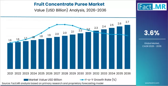The fruit concentrate puree market is set for a consistent upward trajectory over the next decade. Following an estimated valuation of USD 1.9 billion in 2026, the market is expected to climb steadily through the forecast period. Projections indicate sustained value increases in 2028, 2030, and 2031, continuing through 2033 as industrial food processing scales up globally. By 2036, the market is forecasted to reach its peak value of USD 2.7 billion, reflecting an absolute dollar growth of USD 0.8 billion from its 2026 baseline.