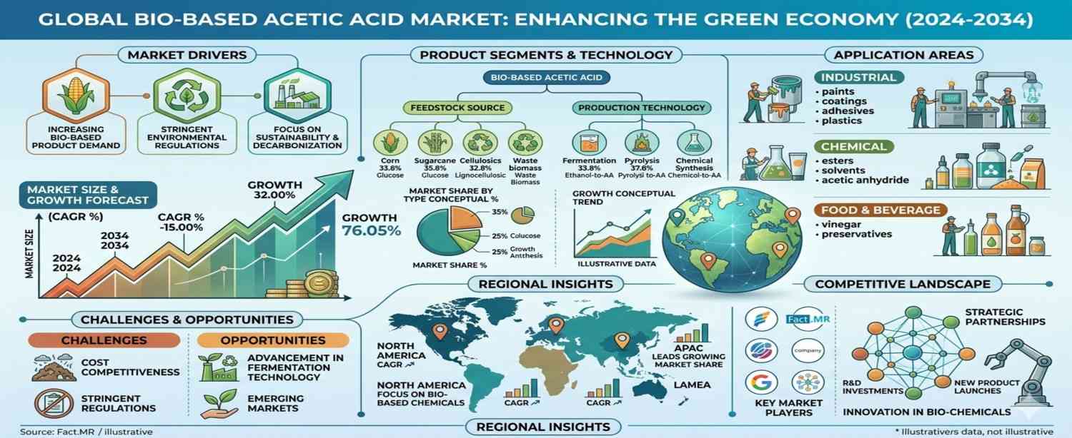The global chemical industry is reaching a pivotal decarbonization milestone. As industrial giants pivot from petrochemical dependence to circular economy models, bio-based acetic acid has emerged as a cornerstone of the “Green Chemistry” movement. New market intelligence reveals the sector is valued at USD 1.4 billion in 2025 and is projected to skyrocket to USD 3.8 billion by 2035—a massive 10.5% CAGR that signals a permanent shift in industrial manufacturing.