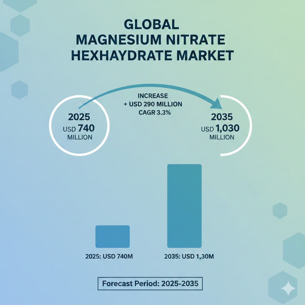 Magnesium Nitrate Hexahydrate Market Expected to Reach USD 1,030 Million by 2035 at 3.3% CAGR.The global magnesium nitrate hexahydrate market is valued at USD 740.0 million in 2025 and is projected to reach USD 1,030 million by 2035. This expansion represents a steady CAGR of 3.3% over the forecast period, with the market size expected to grow by nearly 1.4 times. This growth is primarily fueled by rising demand for agricultural fertilizers and specialized chemical applications alongside increasing global investments in agricultural enhancement platforms.