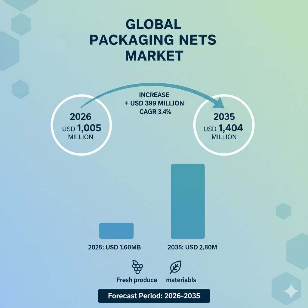 Global Packaging Nets Market Projected to Reach USD 1,404 Million by 2035 at 3.4% CAGR.The global packaging nets market is valued at USD 1,005 million in 2026 and is projected to expand to USD 1,404 million by 2035. Rising at a CAGR of 3.4%, this growth is fueled by a structural shift toward breathable, lightweight solutions for fresh produce and an intensifying regulatory focus on sustainable, biodegradable materials.