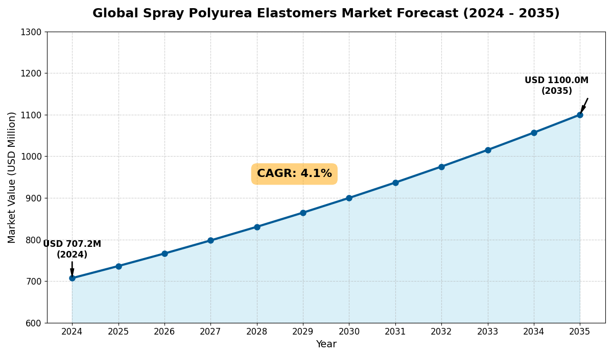 The Spray Polyurea Elastomers Market is on a consistent upward trajectory. Following its 2024 valuation of USD 707.2 million, it is expected to reach USD 736.1 million in 2026. Continued industrial adoption will push the value to approximately USD 798 million by 2028 and USD 866 million by 2030. By 2031, the market will climb to USD 902 million, reaching USD 978 million in 2033, and ultimately achieving the USD 1,100 million milestone by 2035.