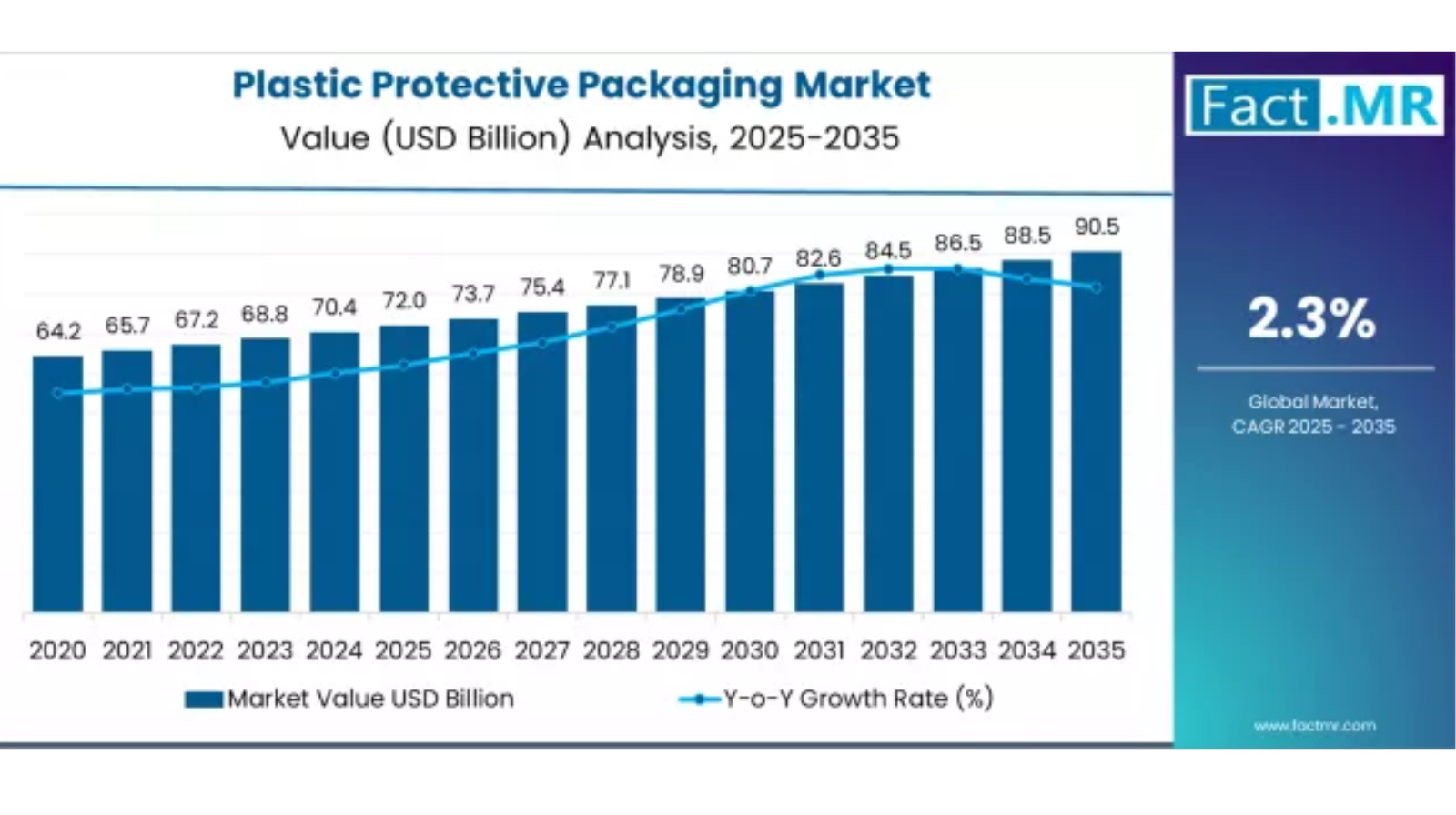 The global plastic protective packaging market is positioned for steady growth over the next decade, supported by expanding e-commerce activity, increasing industrial manufacturing, and rising demand for safe, damage-resistant packaging solutions. According to Fact.MR, the market is valued at USD 72.0 billion in 2025 and is projected to reach USD 90.5 billion by 2035, registering an absolute increase of USD 18.5 billion over the forecast period. This growth reflects a total expansion of 25.7%, with the market advancing at a CAGR of 2.3% from 2025 to 2035.