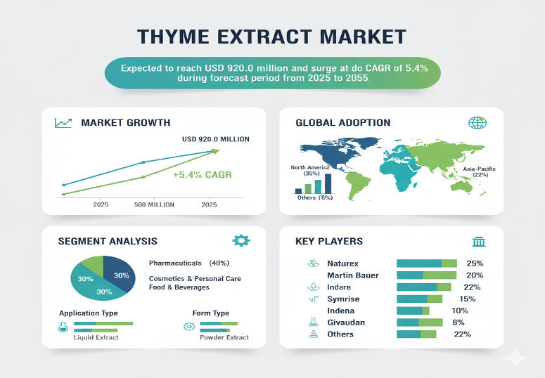 The global thyme extract market is on a strong expansion path, propelled by growing demand for natural, functional ingredients with medicinal and preservative properties. A detailed market assessment estimates the thyme extract market at USD 540.0 million in 2025, with forecasts projecting growth to USD 920.0 million by 2035, representing a CAGR of 5.4% over the decade. Thyme extract is increasingly recognized for its bioactive compounds—such as thymol and carvacrol—which offer antioxidant, antimicrobial, and anti-inflammatory benefits, driving adoption across food & beverage, cosmetics, personal care, and pharmaceutical applications.